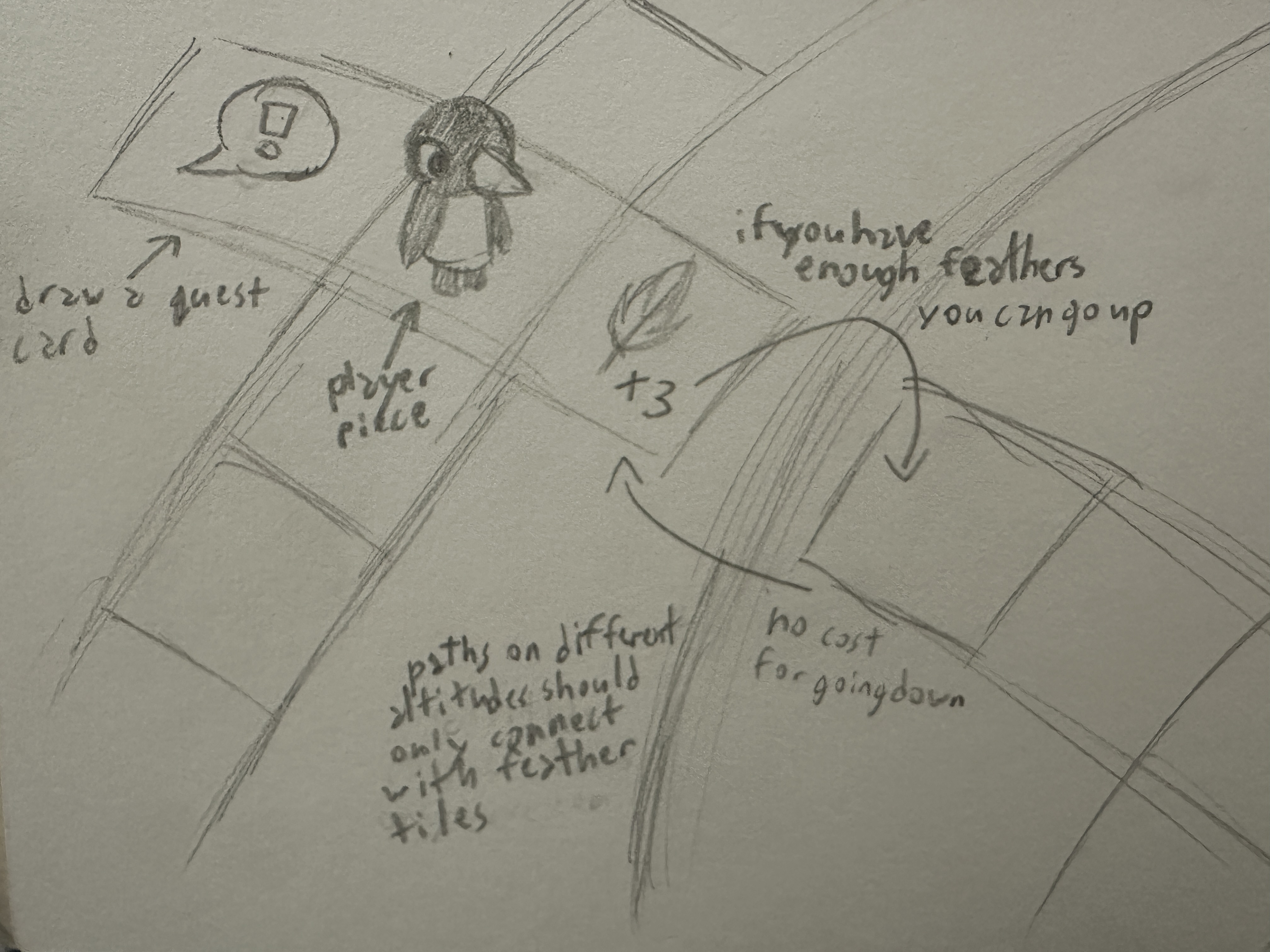 The players would either play as the game’s main character, or as the character who challenges them to a race. We ended up with a board game design that had hexagonal tiles, allowing players to move between spaces freely given their limited range. The tiles either had items, coins, quests, or Feathers. The Feathers were based on the Golden Feathers present in the digital game, allowing the same upgrade of being able to traverse to higher areas of the map. We had our map divided into different height sections, with specific Feather requirements in order to reach them.