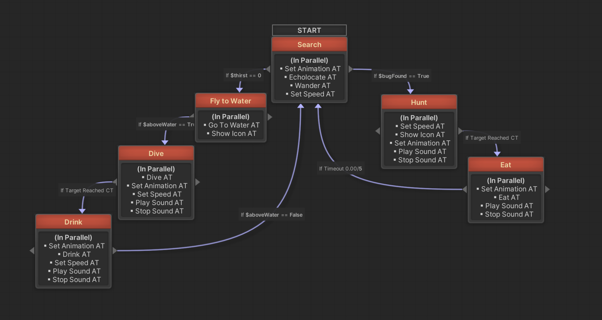 Aside from that, the state machine simply checked whether the bat was hungry or thirsty, and made it catch mosquitos or dive down to the little pond and glide across to drink water, each state with its own animation, as well as little pixel art thought bubbles that telegraph what the bat is thinking! Aside from idly flying, drinking, and eating, the bat had one more final state, which was to go to sleep once it turned morning. The AI simply navigates back to the cave I made for it, and starts playing an animation where the bat hangs upside down, where it sleeps until night time again.