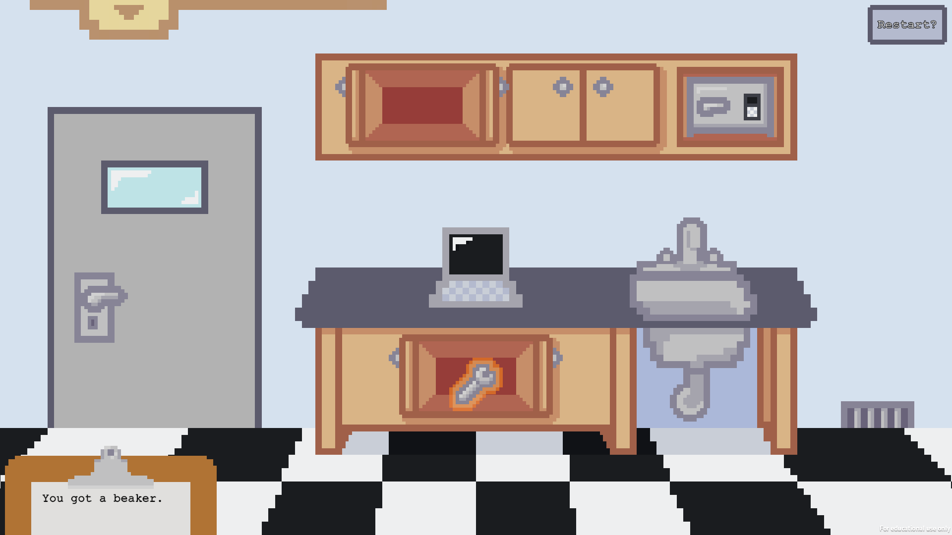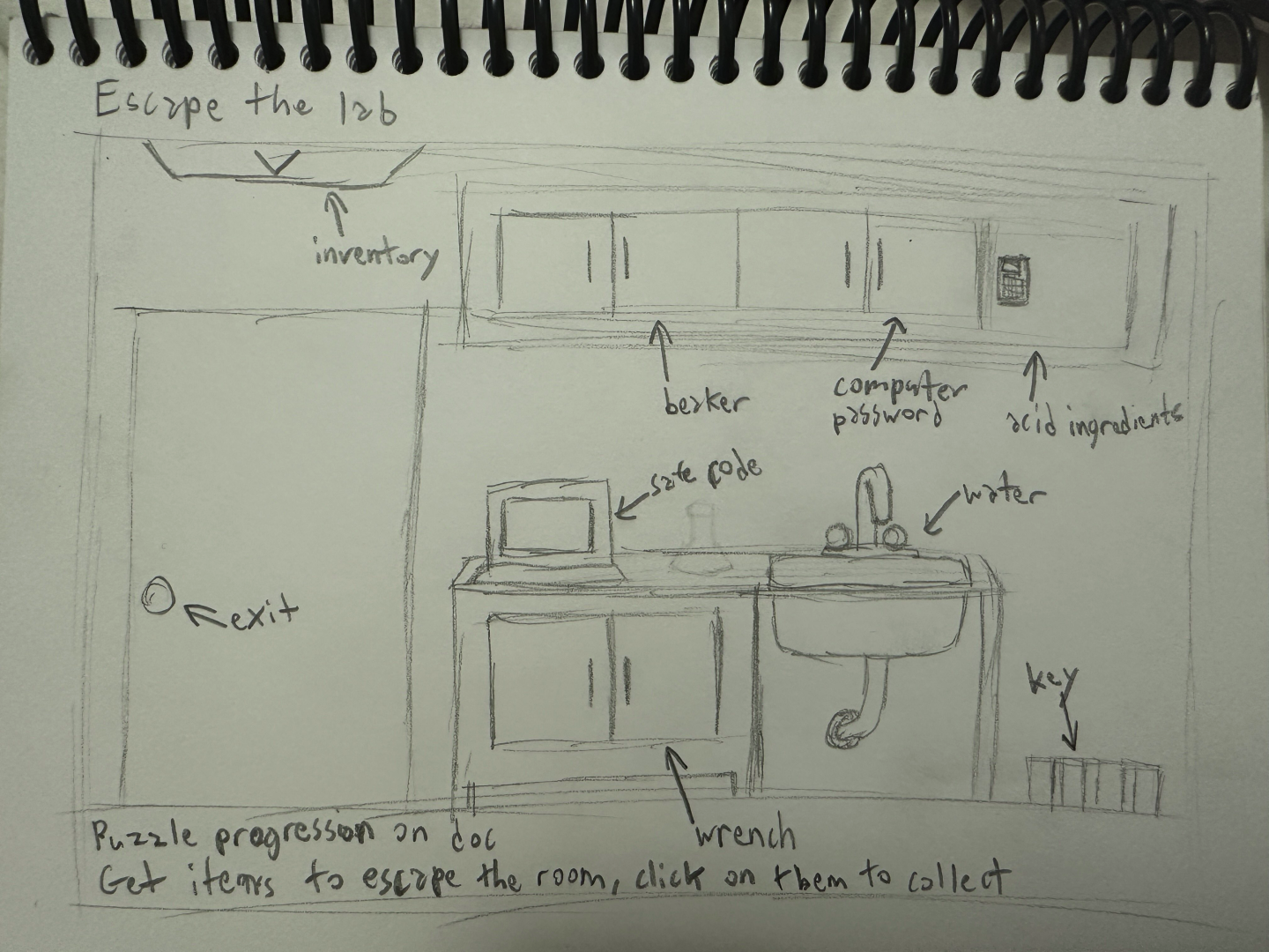 I decided to create a game that was a simple, one-screen escape room. The player is locked in a lab, and must retrieve the key that fell behind a vent in order to unlock the door. I designed a puzzle that led the player to retrieving this key, and had to ensure that they would be able to understand what they can and can’t interact with.