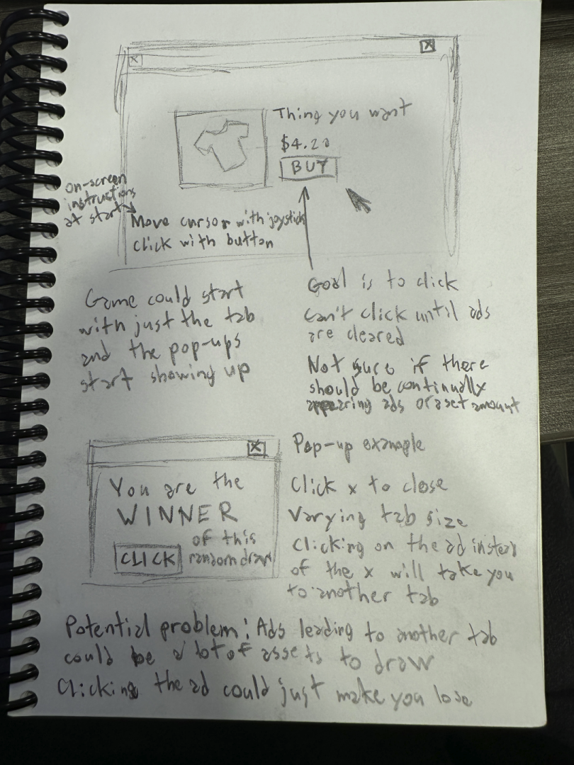 This was a very fun project to work on. Since the length of the game had to be so short, it really allowed us to get more creative with the finer details, especially all the ads we created. Our game really sold the experience of struggling with persistent ads and pop-ups, which led to it being one of the most popular games at the showcase! Many players found it hilarious and also quite challenging to beat!