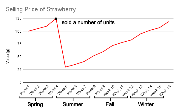 I ended up designing a dynamic supply and demand economy system, where the player selling more items causes the prices of those items to drop, while letting the market starve causes the items to be in demand again and go back up. The prices would also get affected by seasonal changes, like summer crops selling for more when it isn't summer, and yearly changes to different industries.